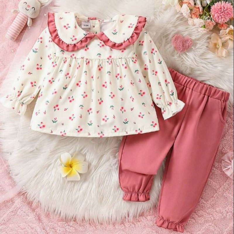 2pcs Set Baby Girl Casual Floral Print Peter Pan Collar Ruffle Trim Long Sleeve Top And Bottoms Set, Suitable For Spring Autumn, Daily, Casual, Party, Outdoor