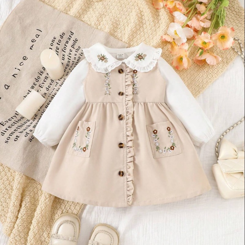 SHEIN Baby Girls' Peter Pan Collar Lace Patchwork Long Sleeve Top And Embroidered Floral Dress With Ruffle Hem And Front Button Pockets Set