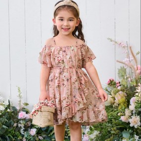 SHEIN Young Girl Floral Print Cold Shoulder Ruffle Trim...