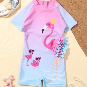 Young Girl Flamingo Print Ruffle Trim One Piece Swimsui...