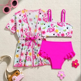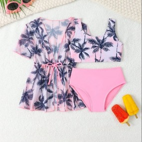 Young Girl 3packs Tropical Print Bikini Set With Kimono...