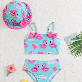 Young Girl Flamingo Print Bikini Set With Bowknot Decor...