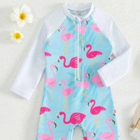 Baby Flamingo Print Zipper Front One Piece Swimsuit