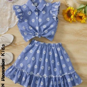 SHEIN Young Girl Floral Print Ruffle Trim Shirt & Skirt
