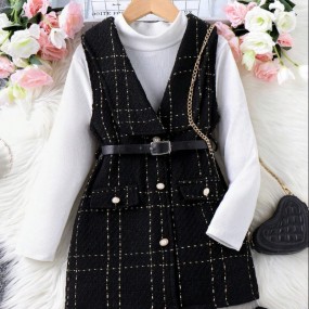 SHEIN Young Girl Mock Neck Tee & Plaid Print Belted Dre...