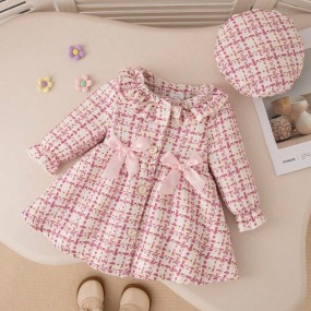 Fall Winter Baby Girl Cute Pink Plaid Lace Collar & Bow...