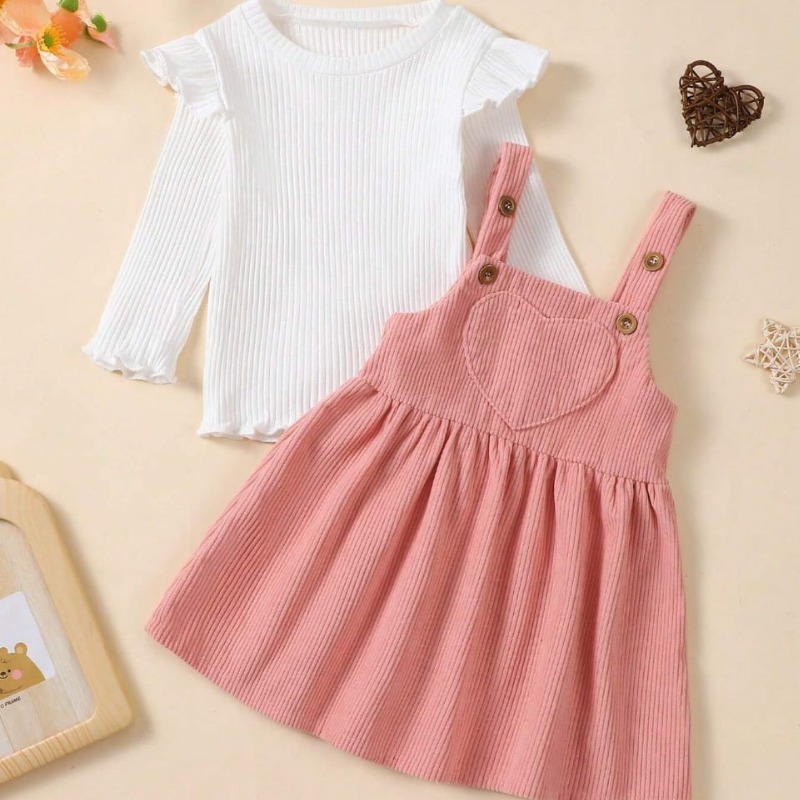 2pcs Set Baby Girl Long Corduroy Strap Dress & White Ruffle Sleeve Sweater, Cute