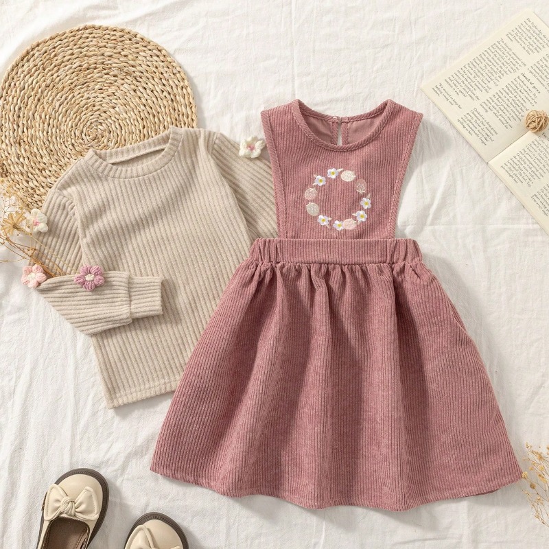 SHEIN Vintaside Kids 2pcs Set Young Girl Casual Floral Decor Top And Dress Set, Autumn