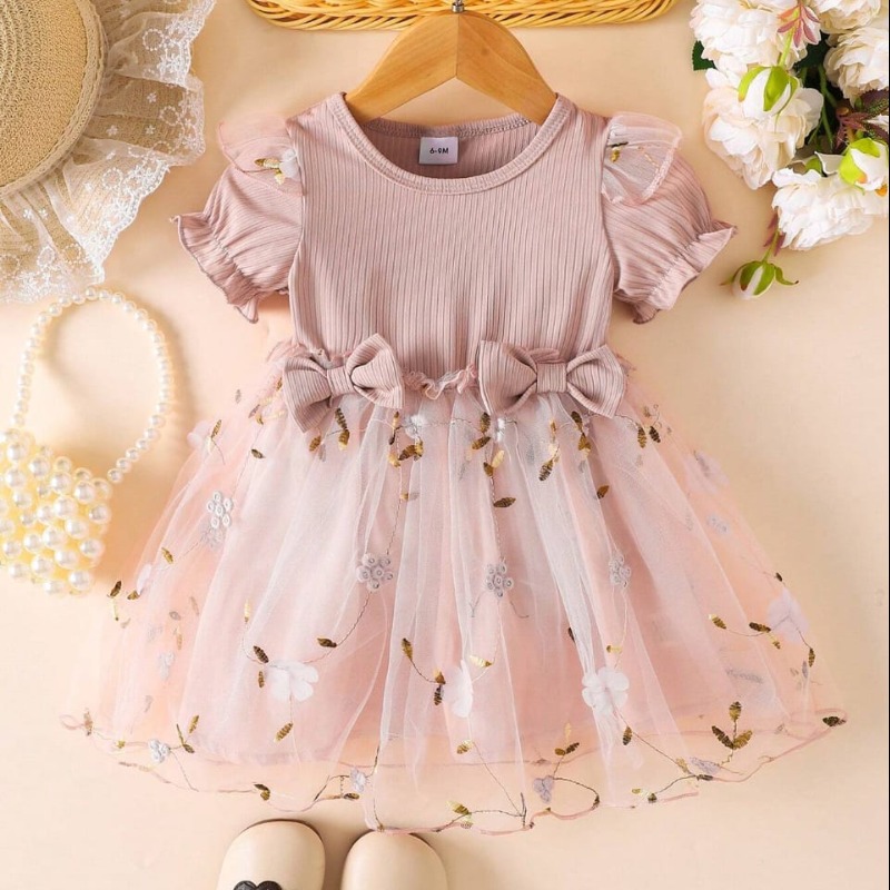 Summer New Baby Girls Mesh Embroidery Flower Trim Short Sleeve Dress