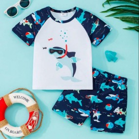 2pcs Young Boy Shark Swimwear Set, Short Sleeve Patchwo...