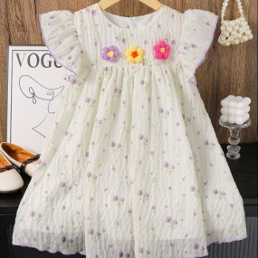 Young Girl Floral Decor Cap Sleeve Dress For Spring Sum...