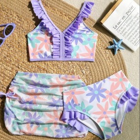 Young Girl Floral Print Ruffled Hem Bikini Set With Cov...