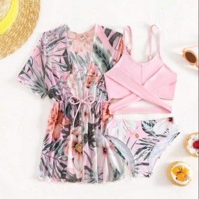 Young Girl 3packs Tropical Print Bikini Set With Kimono...