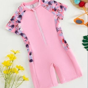 SHEIN Young Girl Plant Print Zipper Front One Piece Swi...