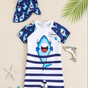 SHEIN 2pcs Set Baby Boy Cartoon Whale Pattern Round Nec...